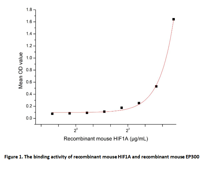 Hypoxia-inducible factor 1-alpha (HIF1A) is a key transcription factor that orchestrates cellular responses to hypoxia. Under normal oxygen conditions, it undergoes rapid proteasomal degradation mediated by the von Hippel-Lindau (VHL) ubiquitination pathway. In hypoxia, however, HIF1A stabilizes and translocates to the nucleus, where it forms a heterodimer with HIF1β and binds to hypoxia-response elements (HREs), activating genes involved in angiogenesis, glycolysis, and erythropoiesis. Its dysregulation is implicated in cancer, ischemic disorders, and metabolic diseases, highlighting its importance as a therapeutic target. Notably, HIF1A directly interacts with E1A Binding Protein P300 (EP300) through its C-terminal transactivation domain, recruiting this coactivator to enhance histone acetylation and drive robust expression of hypoxia-inducible genes.To detect the activity of recombinant HIF1A , a functional ELISA assay was performed to evaluate the interaction between recombinant mouse HIF1A and recombinant mouse EP300. Briefly, HIF1A were diluted serially in PBS, with 0.01% BSA (pH 7.4). Duplicate samples of 100ul were then transferred to EP300-coated microtiter wells and incubated for 2h at 37℃. Wells were washed with PBST and incubated for 1h with anti-HIF1A pAb, then aspirated and washed 3 times. After incubation with HRP labelled secondary antibody, wells were aspirated and washed 3 times. With the addition of substrate solution , wells were incubated 15-25 minutes at 37℃. Finally, add 50μL stop solution to the wells and read at 450nm immediately. The binding activity of HIF1A and EP300 was shown in Figure 1, and this effect was in a dose dependent manner.