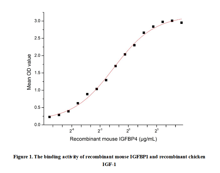 Insulin-like Growth Factor Binding Protein 4 (IGFBP4) is a member of the IGFBP family, which regulates the bioavailability and activity of insulin-like growth factors (IGFs) in various tissues. IGFBP4 binds to IGF-1 and IGF-2 with high affinity, modulating their interaction with IGF receptors and thus influencing cell proliferation, differentiation, and survival. It plays critical roles in growth, development, and metabolic processes. Unlike some other IGFBPs, IGFBP4 is unique in its ability to inhibit IGF actions unless cleaved by specific proteases like PAPP-A , which releases IGFs for receptor activation.To detect the activity of recombinant mouse IGFBP4, a functional ELISA assay was performed to evaluate the interaction between recombinant mouse IGFBP1 and recombinant chicken IGF-1.Briefly, IGFBP4 was diluted serially in PBS with 0.01% BSA (pH 7.4). Duplicate samples of 100 μl were then transferred to IGF-1-coated microtiter wells and incubated for 1h at 37℃. Wells were washed with PBST and incubated for 1h with anti-IGFBP4 pAb, then aspirated and washed 3 times. After incubation with HRP labelled secondary antibody for 1h at 37℃, wells were aspirated and washed 5 times. With the addition of substrate solution, wells were incubated 15-25 minutes at 37℃. Finally, add 50 μL stop solution to the wells and read at 450/630nm immediately. The binding activity of recombinant mouse IGFBP1 and recombinant chicken IGF-1 was shown in Figure 1, the EC50?for this effect is 0.34μg/mL.