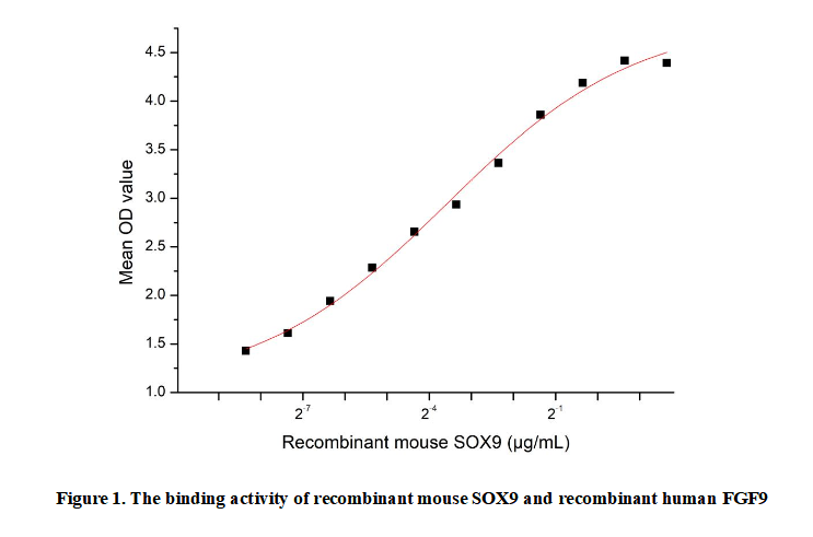 Sex Determining Region Y Box Protein 9 (SOX9) is a transcription factor belonging to the SOX (SRY-related HMG-box) family, which plays crucial roles in embryonic development, cell differentiation, and tissue homeostasis. It is essential for chondrogenesis, male sex determination, and the maintenance of various progenitor cell populations. SOX9 regulates the expression of target genes by binding to specific DNA sequences, influencing pathways such as Wnt/β-catenin and TGF-β.Besides,Fibroblast Growth Factor 9 (FGF9) has been identified as an interactor of SOX9, thus a functional binding ELISA assay was conducted to detect the interaction of recombinant mouse SOX9 and recombinant human FGF9. Briefly, SOX9 was diluted serially in PBS with 0.01% BSA (pH 7.4). Duplicate samples of 100 μl were then transferred to FGF9-coated microtiter wells and incubated for 1h at 37℃. Wells were washed with PBST and incubated for 1h with anti-SOX9 pAb, then aspirated and washed 3 times. After incubation with HRP labelled secondary antibody for 1h at 37℃, wells were aspirated and washed 5 times. With the addition of substrate solution, wells were incubated 15-25 minutes at 37℃. Finally, add 50 μL stop solution to the wells and read at 450/630nm immediately. The binding activity of recombinant mouse SOX9 and recombinant human FGF9 was shown in Figure 1, the EC50?for this effect is 0.08μg/mL.