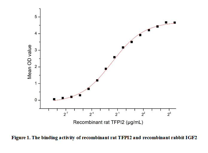 Tissue Factor Pathway Inhibitor 2 (TFPI2) is a serine protease inhibitor primarily produced by endothelial cells, fibroblasts, and placental trophoblasts. It plays a critical role in regulating coagulation by inhibiting the tissue factor (TF)-dependent extrinsic pathway of blood clotting, specifically targeting factor Xa and the TF-factor VIIa complex. Beyond hemostasis, TFPI2 is involved in extracellular matrix remodeling, wound healing, and angiogenesis. It also exhibits tumor-suppressive properties by inhibiting matrix metalloproteinases (MMPs) and preventing tumor invasion and metastasis. Reduced TFPI2 expression is associated with various cancers, including pancreatic, ovarian, and colorectal cancer, making it a potential biomarker for tumor progression. Additionally, TFPI2 has been implicated in cardiovascular and inflammatory diseases.Besides,Insulin Like Growth Factor 2 (IGF2) has been identified as an interactor of TFPI2, thus a functional binding ELISA assay was conducted to detect the interaction of recombinant rat TFPI2 and recombinant rabbit IGF2. Briefly, TFPI2 was diluted serially in PBS with 0.01% BSA (pH 7.4). Duplicate samples of 100 μl were then transferred to IGF2-coated microtiter wells and incubated for 1h at 37℃. Wells were washed with PBST and incubated for 1h with anti-TFPI2 pAb, then aspirated and washed 3 times. After incubation with HRP labelled secondary antibody for 1h at 37℃, wells were aspirated and washed 5 times. With the addition of substrate solution, wells were incubated 15-25 minutes at 37℃. Finally, add 50 μL stop solution to the wells and read at 450/630nm immediately. The binding activity of recombinant rat TFPI2 and recombinant rabbit IGF2 was shown in Figure 1, the EC50?for this effect is 0.32μg/mL.