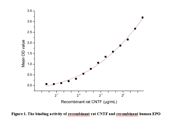 Ciliary Neurotrophic Factor (CNTF)?is a 22 kDa cytokine initially identified for its role in supporting parasympathetic neuron survival. It signals through a tripartite receptor complex to activate JAK-STAT pathways, particularly STAT3. Primarily expressed in Schwann cells and astrocytes, CNTF promotes neuronal survival, differentiation, and regeneration in both CNS and PNS. It demonstrates neuroprotective effects in models of ALS, Huntington's disease, and retinal degeneration. Unlike classical cytokines, CNTF lacks a signal peptide and is released after cellular injury. Current research explores its therapeutic potential for neurodegenerative disorders and metabolic regulation.Besides,Erythropoietin (EPO) has been identified as an interactor of CNTF, thus a functional binding ELISA assay was conducted to detect the interaction of recombinant rat CNTF and recombinant human EPO. Briefly, CNTF was diluted serially in PBS with 0.01% BSA (pH 7.4). Duplicate samples of 100 μl were then transferred to EPO-coated microtiter wells and incubated for 1h at 37℃. Wells were washed with PBST and incubated for 1h with anti-CNTF pAb, then aspirated and washed 3 times. After incubation with HRP labelled secondary antibody for 1h at 37℃, wells were aspirated and washed 5 times. With the addition of substrate solution, wells were incubated 15-25 minutes at 37℃. Finally, add 50 μL stop solution to the wells and read at 450/630nm immediately. The binding activity of recombinant rat CNTF and recombinant human EPO was shown in Figure 1, and this effect was in a dose dependent manner.