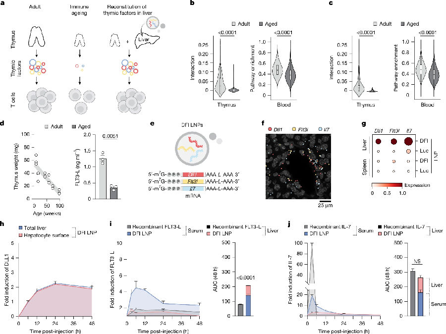 2025年12月17日,有研究團隊在《Nature》期刊上發(fā)表了題為“Transient hepatic reconstitution of trophic factors enhances aged immunity”的文章,該研究證明通過mRNA給藥臨時改變肝臟功能可恢復衰老小鼠的免疫信號并改善T細胞功能。Notch和Fms-like tyrosine kinase 3 ligand(FLT3L)通路及IL-7信號會隨年齡增長而衰退。向肝細胞遞送編碼Delta-like ligand 1(DLL1)、FLT3L和IL-7的mRNA可增加淋巴祖細胞數(shù)量,促進新生胸腺細胞生成而不影響造血干細胞組成。用這些mRNA進行治療,不僅能增強肽疫苗的免疫應答,還能通過提升腫瘤特異性CD8+細胞浸潤,與免疫檢查點阻斷療法產(chǎn)生協(xié)同效應,從而恢復老年小鼠的抗腫瘤免疫力。且這些效果在停藥后可逆,不會破壞自身免疫耐受。