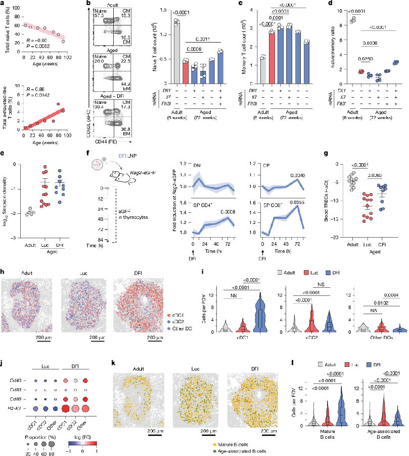 衰老伴隨著初始T細胞的丟失及耗竭樣狀態(tài)的積累,這種現(xiàn)象在CD8+T細胞中最為顯著,并由胸腺退化、慢性抗原暴露和炎癥驅(qū)動。老年小鼠每周接受兩次DFI mRNA–LNPs或Luc mRNA–LNPs治療,持續(xù)28天。結(jié)果發(fā)現(xiàn)DFI(而非單一因子)提高了循環(huán)中初始(CD44-CD62L+)CD4+和CD8+T細胞的頻率和絕對數(shù)量,但并未增加記憶亞群。因此,DFI處理動物血液和脾臟中的初始細胞與記憶細胞比例上升。且DFI選擇性擴增了早期T細胞譜系定向階段的胸腺細胞,并在12小時內(nèi)誘導Rag2–eGFP小鼠胸腺細胞中表達Rag2(在小鼠胸腺細胞中,Rag2會影響T細胞發(fā)育、免疫系統(tǒng)功能等)。隨后在治療28天后,成熟的單陽性CD4+和CD8+胸腺細胞數(shù)量增加至年輕小鼠水平。循環(huán)T細胞中Nur77表達升高,提示胸腺遷移細胞增加。研究者還發(fā)現(xiàn)DFI通過擴增定向分化淋巴祖細胞并促進胸腺內(nèi)成熟,而不改變造血干細胞組成,從而增強初始T細胞的輸出。除T細胞外,DFI還減輕了抗原呈遞細胞和B細胞區(qū)室中與衰老相關的表型。(見圖2)