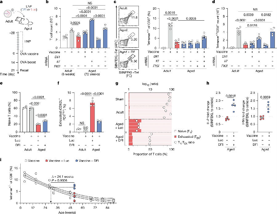基于上述發(fā)現(xiàn),研究者接下來測試了DFI能否恢復老年動物的適應性免疫功能。作為測試案例,觀察了疫苗應答——一種已知會因衰老而減弱的T細胞介導過程。在成年(6周齡)和老年(72周齡)小鼠的佐劑卵清蛋白(OVA)初免-加強模型中,老年組在接種疫苗后脾臟和血液中OVA特異性CD8+T細胞較少,抗原驅(qū)動的細胞增殖受損,再次免疫時IL-2和IFNγ生成量減少,接近假疫苗接種對照小鼠的水平。在接種前用DFI組合對老年小鼠進行預處理顯示,總T細胞和OVA特異性CD8+細胞頻率同時增加,因而脾臟中抗原特異性CD8+T細胞增加約兩倍,血液中也出現(xiàn)類似增幅,而這種表型在重復接種后進一步擴大。DFI處理組在疫苗接種后保留了更高的初始細胞比例,并減少了PD1highCD62L-細胞,產(chǎn)生了更平衡的T細胞組成。功能上,DFI處理小鼠的CD8+T細胞在抗原特異性再刺激下產(chǎn)生了更高水平的IL-2和IFNγ,而OVA特異性CD4+細胞頻率和細胞因子基本保持不變,表明DFI優(yōu)先支持CD8+T細胞反應。DFI治療能將老年小鼠的疫苗誘導T細胞數(shù)提升至與年輕小鼠相當?shù)乃?。(見圖3)