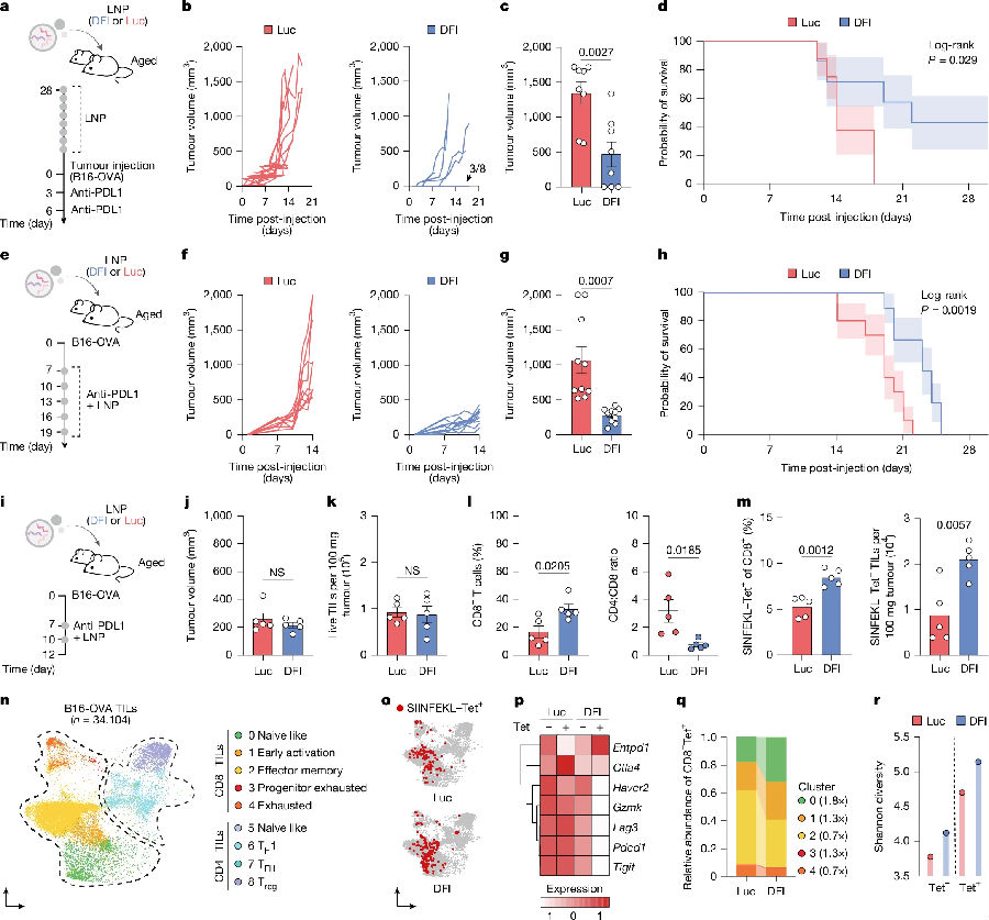 抗PDL1治療,仍于3周內(nèi)死亡。在已建立腫瘤的老年小鼠中,治療開始時聯(lián)合給藥與單獨PDL1阻斷相比,同樣能延緩疾病進展并提高生存率。且研究者發(fā)現(xiàn)DFI增加了腫瘤內(nèi)CD8+T細胞頻率,腫瘤浸潤淋巴細胞總數(shù)未發(fā)生變化。DFI治療后,耗竭相關基因(Havcr2、Gzmk、Lag3、Pdcd1和Tigit)表達水平下降。這些研究結(jié)果表明單獨使用DFI調(diào)節(jié)即可增強內(nèi)源性抗腫瘤,與PDL1阻斷協(xié)同作用可提高老年小鼠的治療效果。(見圖4)